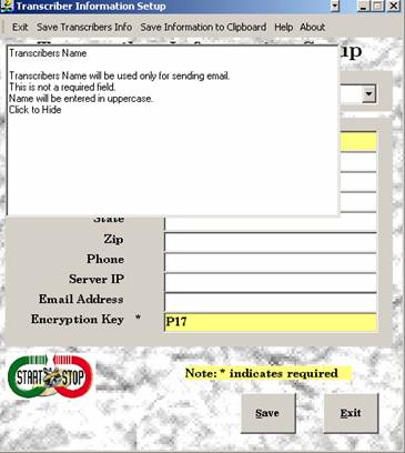 Help can also be accessed on most input fields by placing your cursor in the field and hitting the F1 key. A pop-up box will be displayed on your screen explaining the purpose of the field your cursor is set on. An example: Set the cursor is on the field “Transcribers Name” in the Transcribers Information setup menu. Hit the F1 key. Clicking inside the box closes the help box.